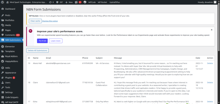 Before implementing this workflow, the client’s website was continuously receiving unwanted spam through contact forms, lead forms, and Elementor submissions. These spam entries were coming from bots, fake emails, disposable domains, and auto-generated messages — making it difficult for the team to track genuine leads.