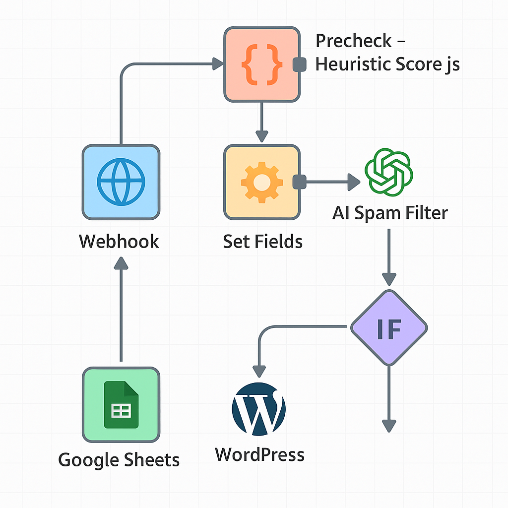 The WordPress Spam Filter Agent is an automated n8n workflow designed to protect websites from fake submissions, bot-generated messages, and low-quality leads. It uses a multi-layer filtering process that combines strict field validation, heuristic scoring, and AI-based classification to accurately detect and block spam before it reaches WordPress. Genuine submissions are safely stored and notified to the team, while spam entries are logged separately for analysis. This solution ensures clean data, saves manual effort, and keeps the website’s lead generation system secure and efficient.