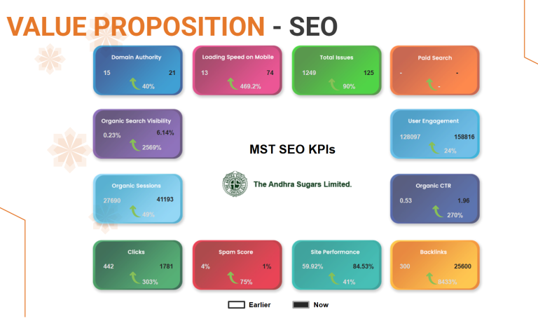 The Andhra Sugars Ltd., a leader in sugar, chemicals, and pharmaceutical intermediates, partnered with Mind Spark Technologies to fix issues like poor keyword visibility, outdated SEO, slow page speed, and low organic leads. After a complete website revamp with improved design, development, and targeted Organic SEO, the results were clear within six months—1,145% growth in organic traffic, keyword rankings rising from 3 to 42+, session duration increasing from 45 seconds to 2 minutes 15 seconds, and organic enquiries growing by 80%, giving the brand a stronger and more impactful digital presence.